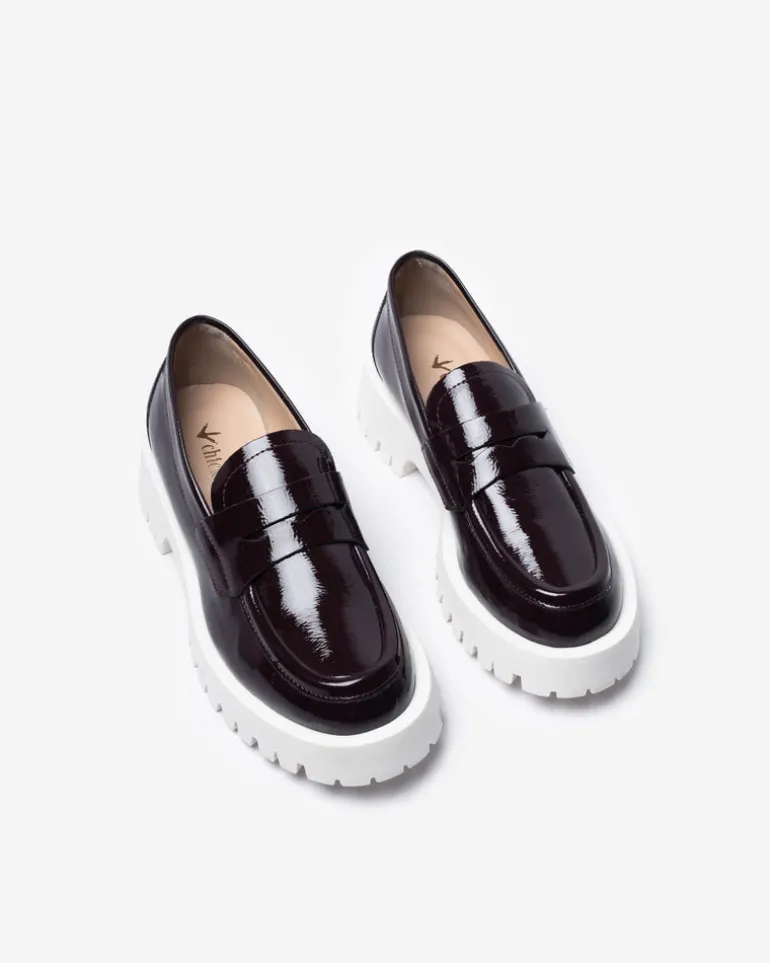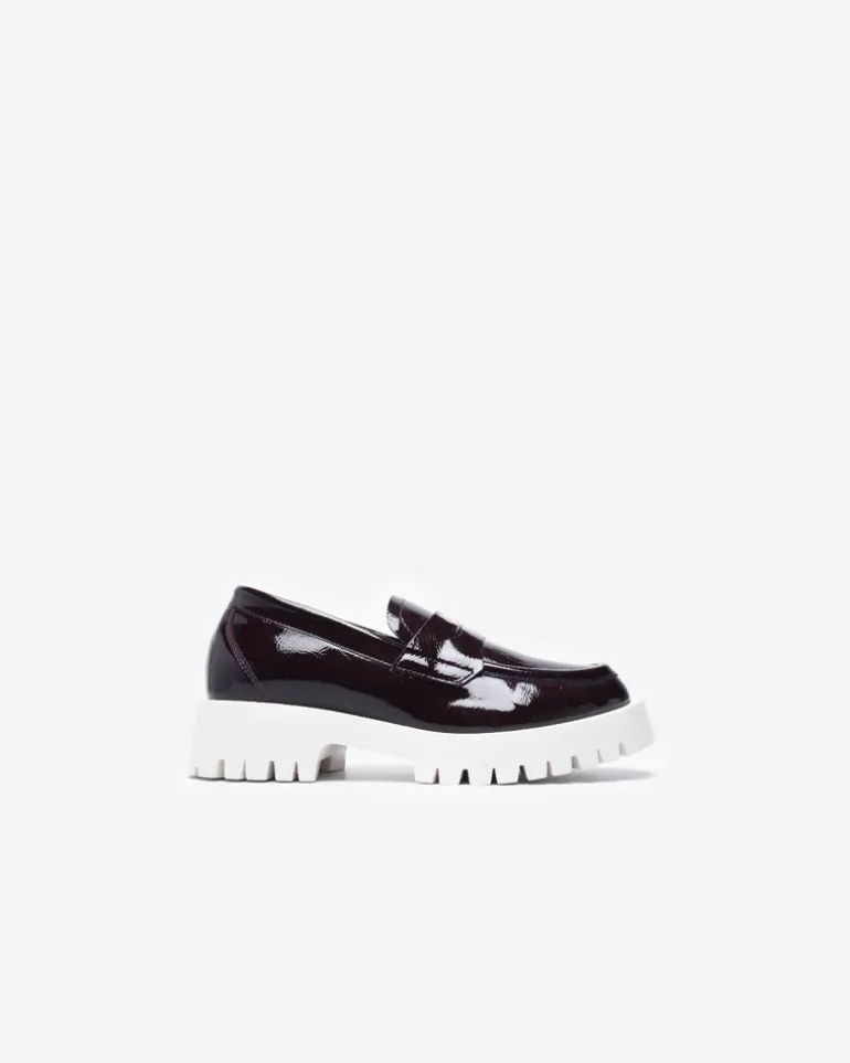 Mocassino in similpelle bordeaux con suola in gomma a contrasto di 4cm e sottopiede in vera pelle, lavorato artigianalmente in Italia.