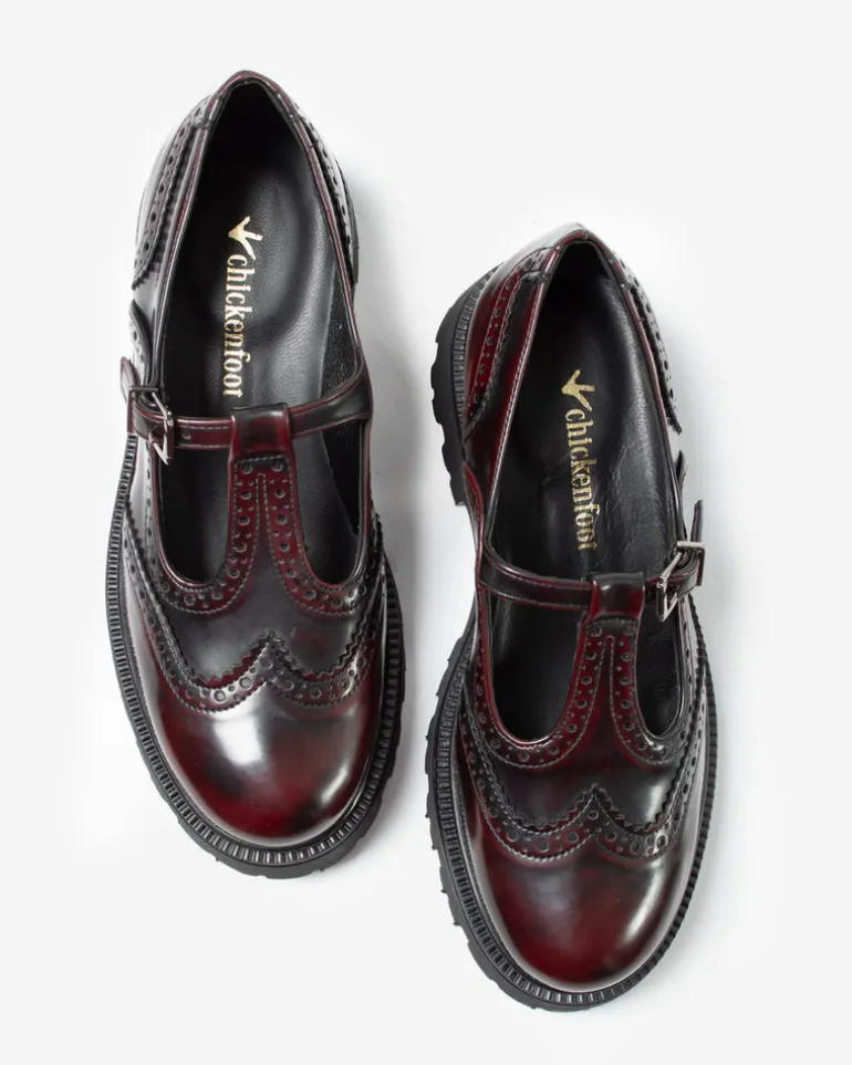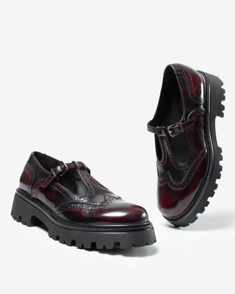 Mary jane bordeaux effetto spazzolato in similpelle con occhielli e forature decorative, cinturino regolabile e suola a carrarmato in gomma.
