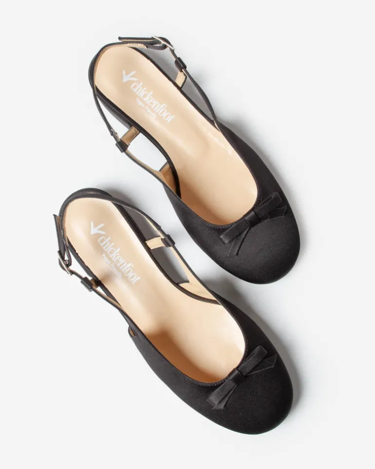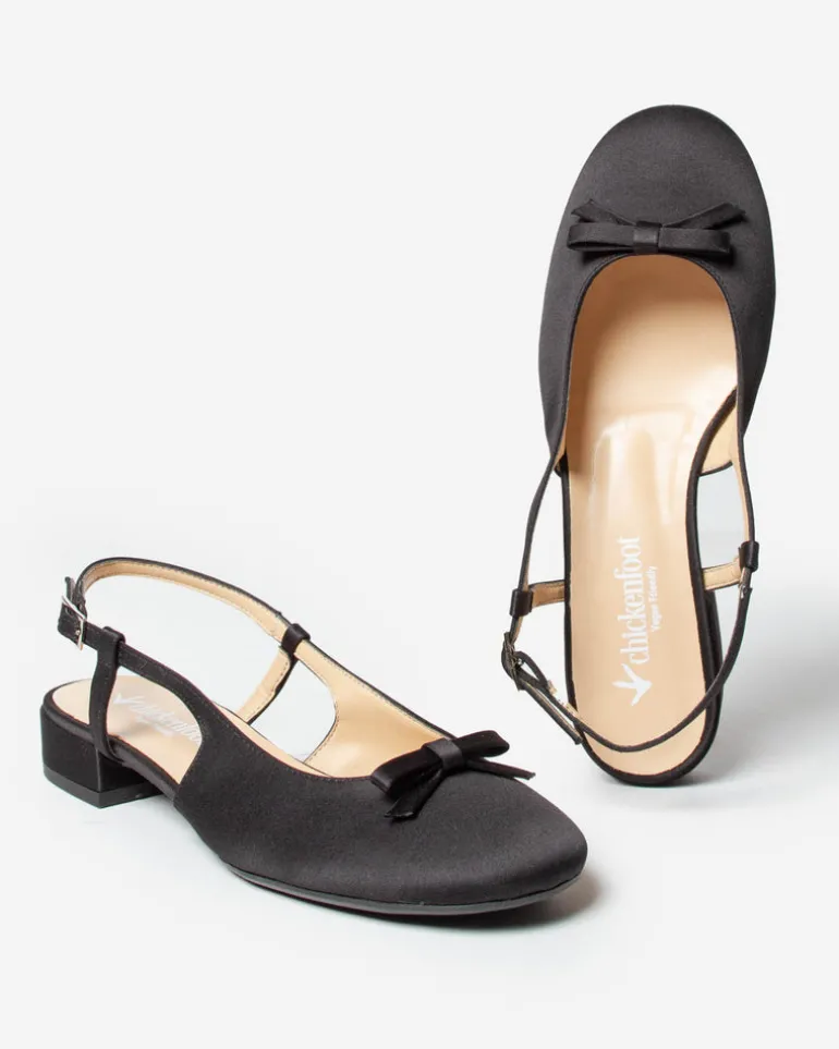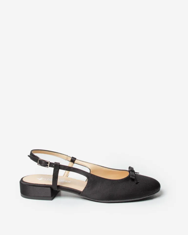 Slingback realizzata in Italia in similpelle con punta arrotondata, fiocchetto decorativo sullo scollo, cinturino regolabile e tacco.
